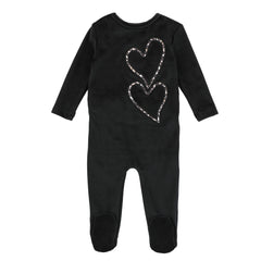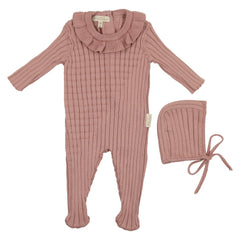 Mema Knits Pale Pink / Rose Brown Heart Ribbed Velour Embroidered Footie + Bonnet