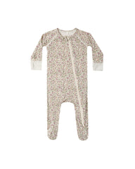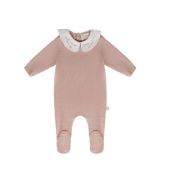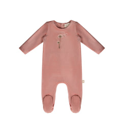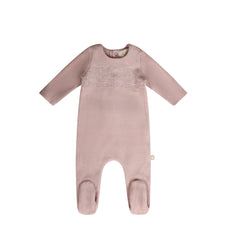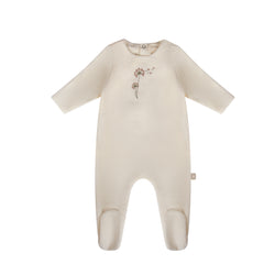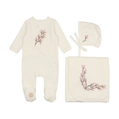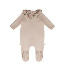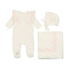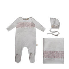 Mema Knits Ivory / Rose Smoke Embroidery French Terry Embroidered Bebe Footie + Beanie