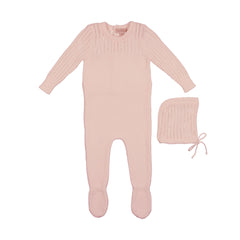 Mema Knits Pale Pink Pointelle Footie And Cardigan Set + Bonnet