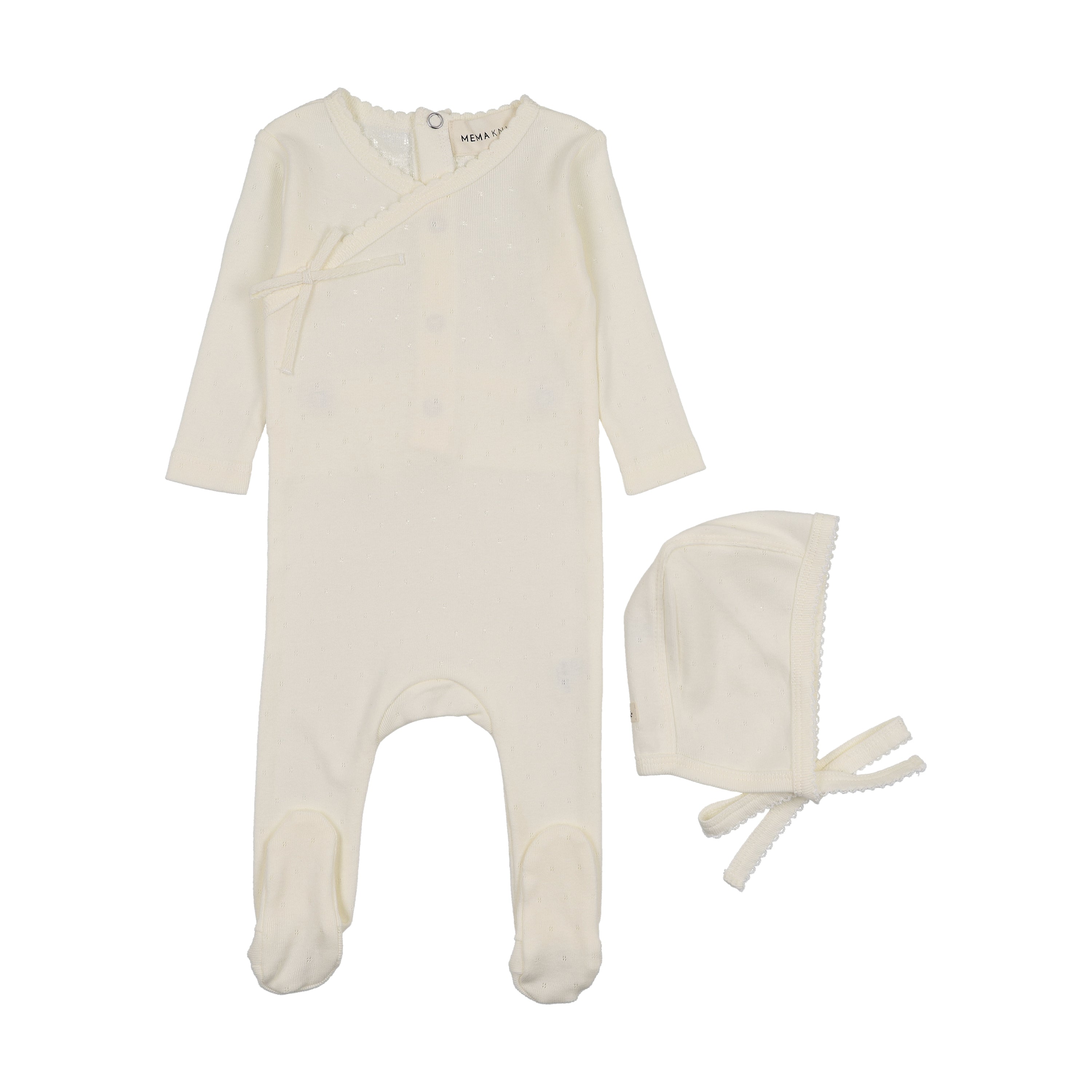 Mema Knits Ivory Pointelle Scalloped Edge Footie + Bonnet