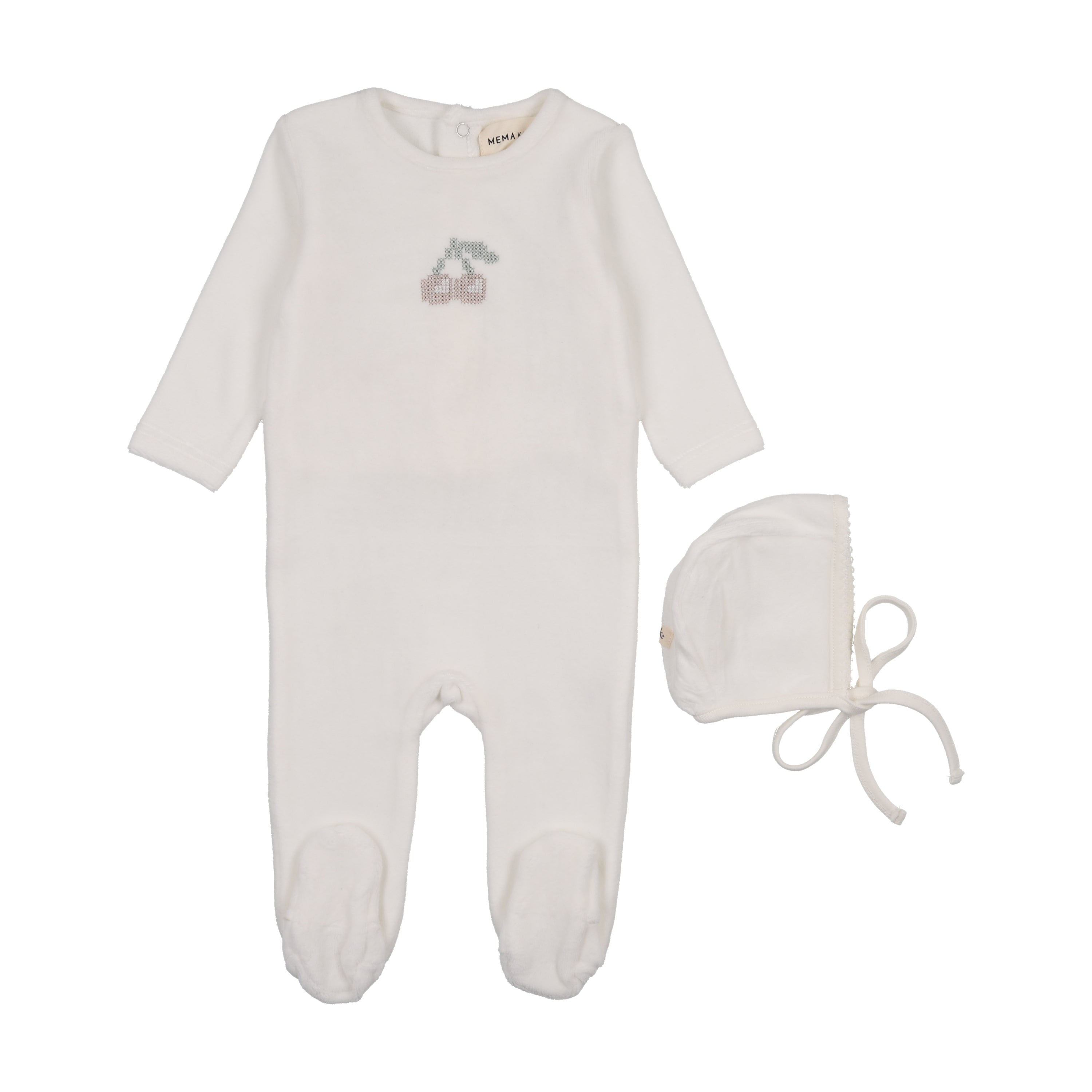 Mema Knits Winter White / Taupe Cherry Velour Embroidered Cherry Footie + Bonnet