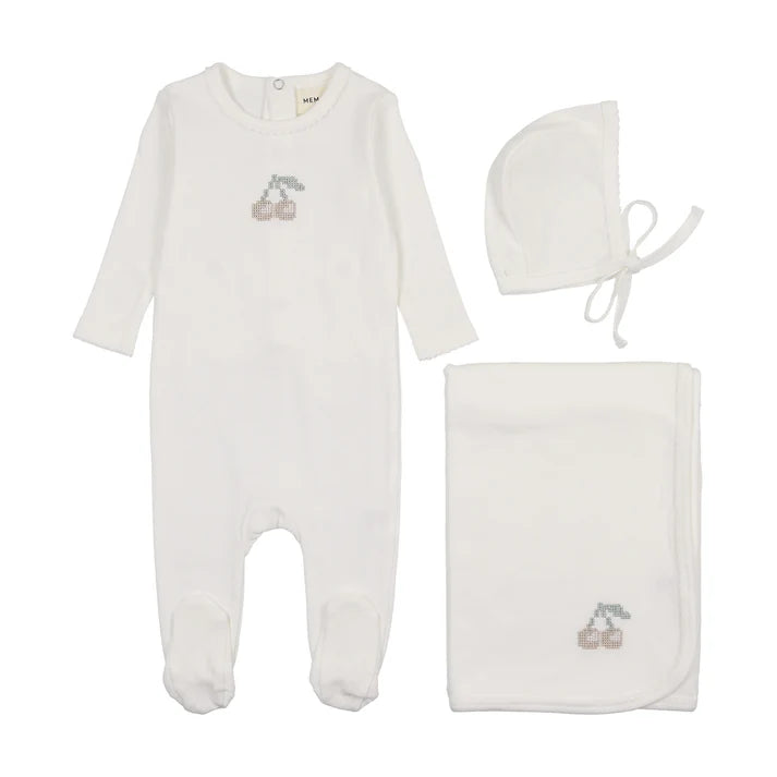 Mema Knits Winter White / Taupe Cherry Velour Embroidered Cherry 3 Pc Set M449-3pc